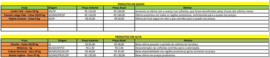O limão Taiti registrou queda de 9% nesta semana na Ceasa/MS (Centrais de Abastecimento de Mato Grosso do Sul), reflexo da boa oferta da fruta nas regiões produtoras em MS e São Paulo. As chuvas favoreceram as colheitas e mantêm a produção estável.